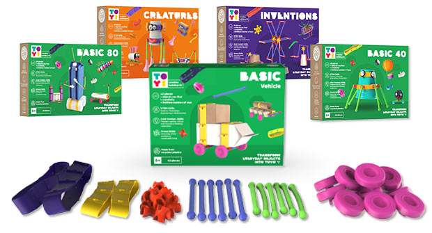 TOYI toy packages feed the child's imagination and encourage to experiment. A toy package contain various elements that can be put together as you wish - there are no binding instructions. Everything is allowed and the end result can be different every time. The toys are made from recycled materials.
